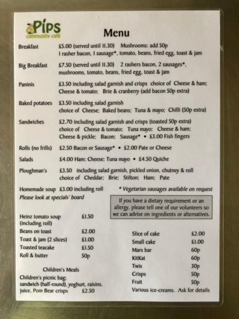 Pips offers an inviting menu that features a delightful selection of homemade cakes, hearty breakfasts served until 11:30 AM, tempting light lunches, and a variety of hot and cold drinks. Start your day with a quintessential breakfast that includes sausage, bacon, freshly cooked eggs, and toast served with your choice of jam or marmalade—all for only £5.00! The homemade cakes, varying in flavor week by week, offer an enticing sweet finish to your meal, with generous slices priced at just £2.00. Their homemade soup, available in three varieties each day, served with a comforting roll and butter, is a reliable choice for a light and satisfying lunch at only £3.00.